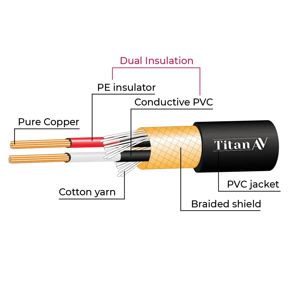 Titan AV XLR cables offer dual insulation (PE insulator & conductive PVC) and an extremely low capacitance. The lower the capacitance the better the cable performance with high speed data providing less distortion.