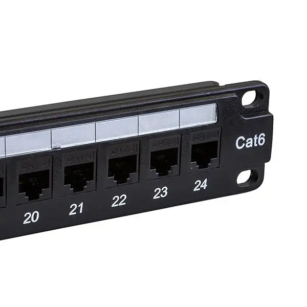 Titan AV Category 6 Patch Panels offer functionality and compatibility. Each panel comes with 110-type termination while meeting EIA/TIA TSB-40 Cat6 connecting hardware specifications. This 24 port patch panel ensures a wide range of plug and play options and with the space saving 19″ 1RU design, saving valuable space in the rack has never been easier. This patch panel is a 19″ 1RU 24 port Cat6 and is compatible with our complete range of 19″ road cases, 19″ server cases, communications equipment and network gear.