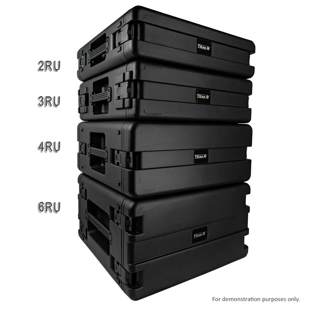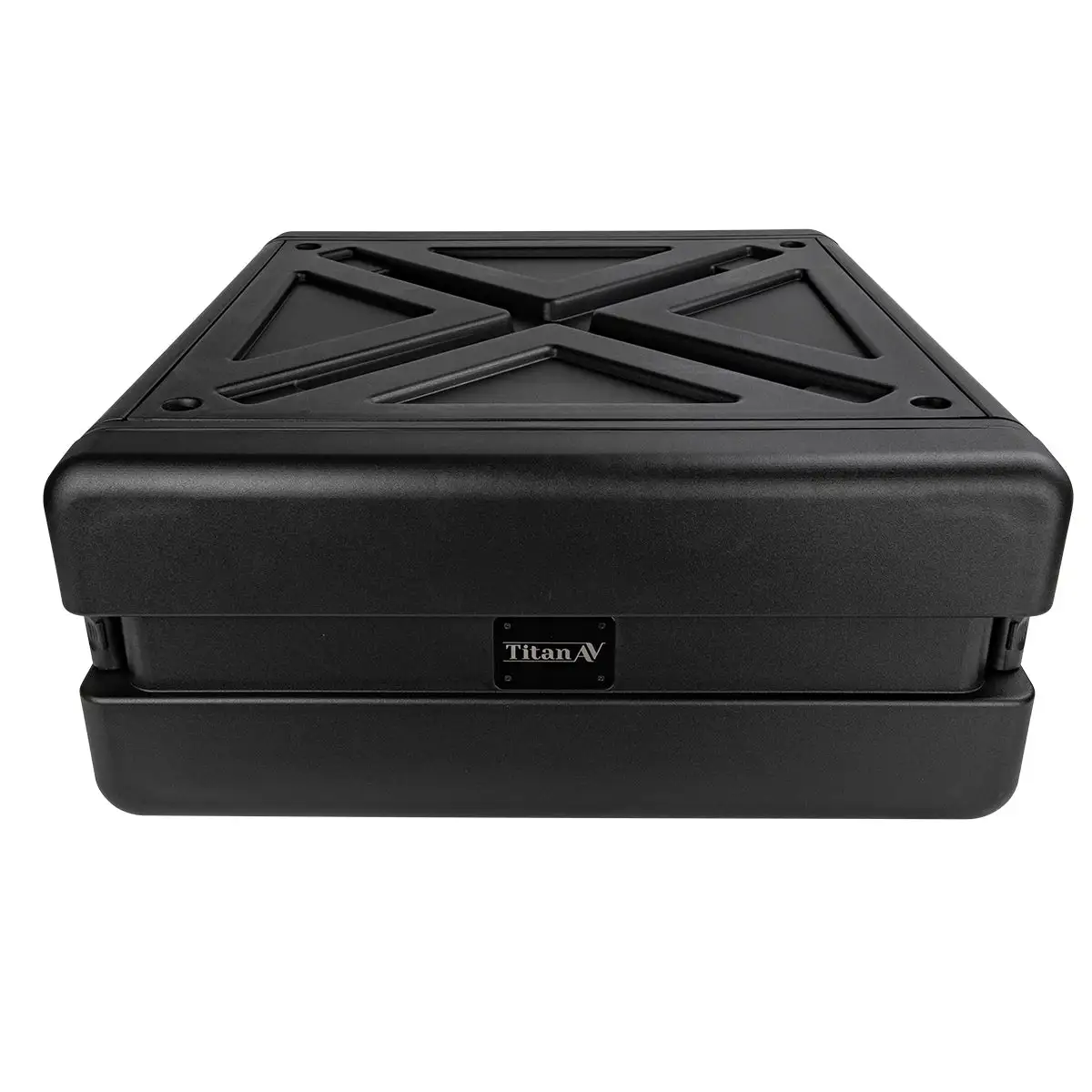 Sleek, stylish, and insanely rugged, the Titan AV X-Series rack cases boasts a strong light weight Polypropylene shell, TUFF latching system and a water resistant design. Exterior features include the X on the top and bottom doubling up for improved strength and providing interlocking capabilities allows for easy and secure stacking. Lids include rubber gasket seals to keep water out, other standard features include front and rear steel rack rails designed to work with cage nuts and M6 machine screws. Flush carry handles, latches, and non-slip rubber feet are a few more features that set this case apart from the run of the mill. With a racking depth of 455mm most modern 19″ rack equipment mount in perfectly, this rack depth of 455mm can be found across the range 2RU, 3RU, 4RU, 6RU, 8RU, 10RU, 12RU rack cases. rack cases.