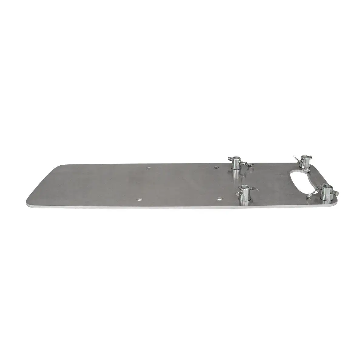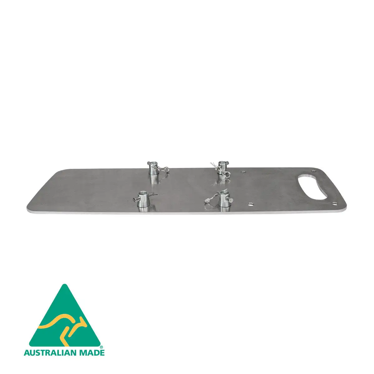 These ally plates are back savers, only weighing in at 2.6kg making setup and pack up a breeze. CNC cut from 8mm 5005-H34 aluminium plate with multiple positioning points located in the centre and rear of the plate. The over sized ergonomic handles are large enough to accommodate protective gloves and sit comfortably in your grip, also perfect for securing the plate with over sized pegs. This style of truss base plate has been designed for use with indoor truss arches, having centre mounts allows for the end user to free stand their truss arch or when using the rear mounts the truss frame can be pushed onto a wall for extra safety and space saving.